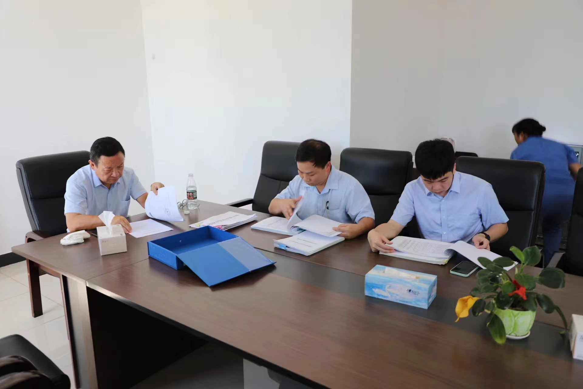 集團總裁趙越等一行先后深入到集團各下屬子公司濱海綜合服務有限公司后勤飯?zhí)谩⑺豆鞠聦賳挝浑姵俏鬯幚韽S、城投公司東灣綠城棚戶區(qū)改造項目施工現(xiàn)場、爵山食品公司生產車間、吉達港場平二期施工現(xiàn)場以及水投公司(本部)廠區(qū)進行督導檢查。