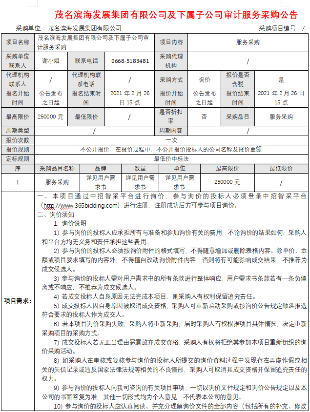茂名濱海發展集團有限公司及下屬子公司審計服務采購